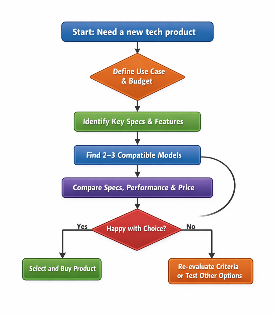 Embedding structured comparison methods into your buying process can save time and prevent regrets. As one guide puts it, a “structured checklist” helps you avoid impulse decisions and choose the right tech product for your needs. The first step is always defining your use case and budget. Are you buying a laptop for heavy video editing or just browsing and emails? The answer sets all priorities (speed vs. battery life vs. weight). Once clear, identify the core specifications that matter most for that use. Experts recommend focusing on 2–3 main specs per category – for example, CPU, RAM, and SSD for laptops, or processor, memory, and battery size for smartphones. Ignore flashy but minor features; instead, match the specs to your tasks. If in doubt, refer to authoritative reviews or tech blogs to see how those specs translate into real-world results.